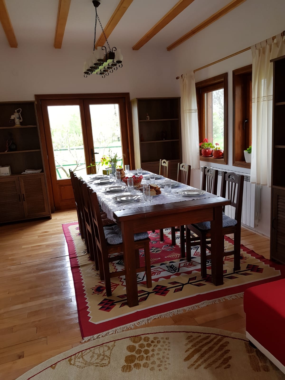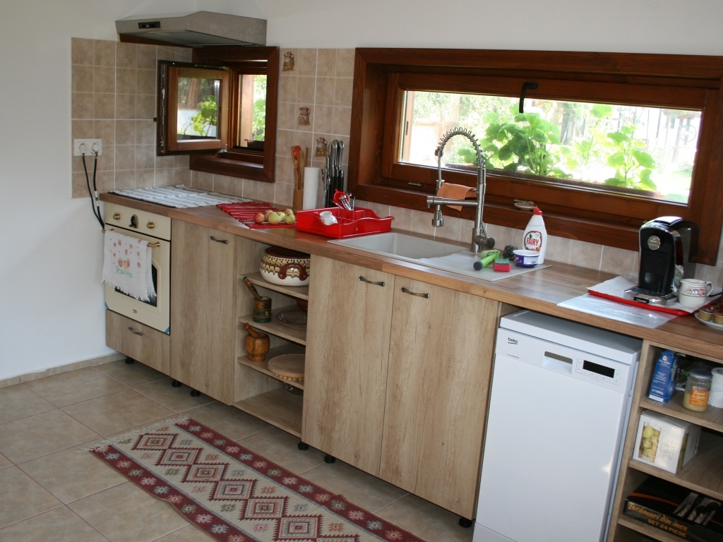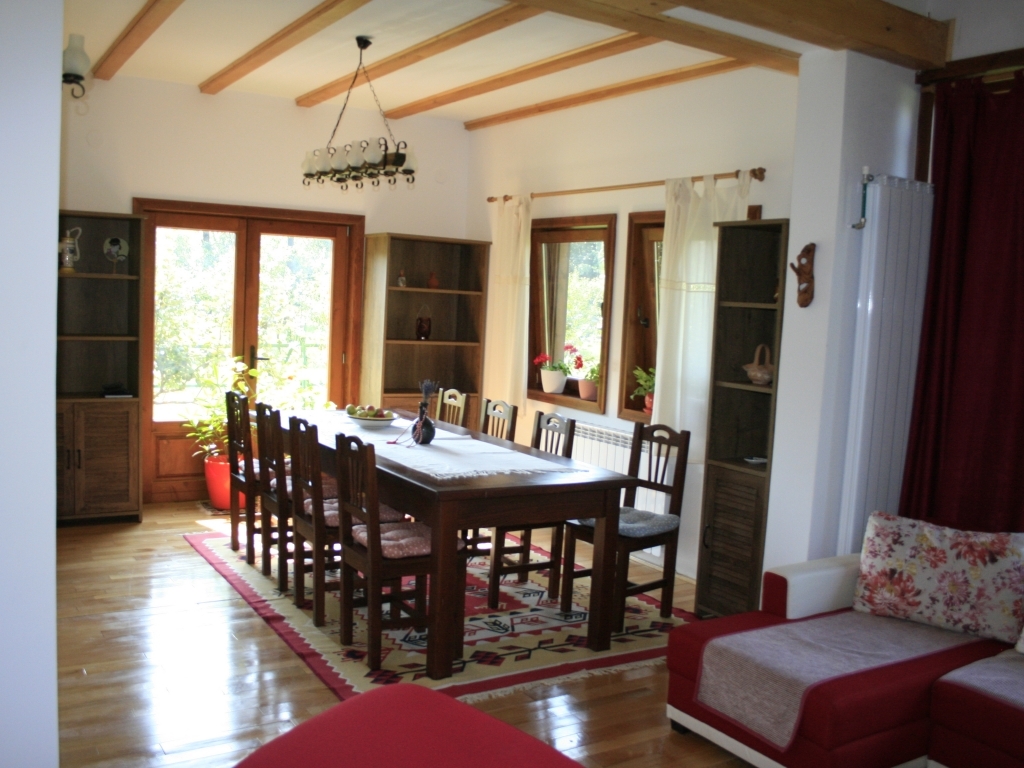 Veți găsi un living spațios, biblioteca, un loc de servit masa cu masa de 8 locuri și o bucătărie complet utilată cu electrocasnice noi (prajitor, cuptor microunde, plita de gatit, cafetiera) si dotari pentru servirea mesei.